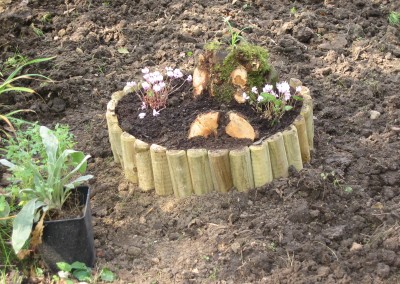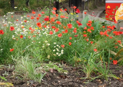 The poppies and other wild flowers we sowed at the end of June are still providing a cheerful splash of colour at one corner of the garden. The seeds came from the Lottery project ‘Grow Wild’ and we have several more boxes which we intend to sow next spring. Many visitors have commented on the flowers and they have been an inspiration to the gardeners. We can start to imagine what the garden will look like next year. We are planning to plant a mixture of garden flowers, which we know are attractive to insects, and wild flower seeds. We are adding colour to the garden where we can and Sue made a small raised bed around a tree stump and has planted bulbs and these cyclamen. [Click on the pictures to see the flowers better.]
