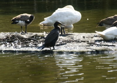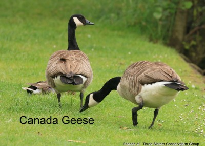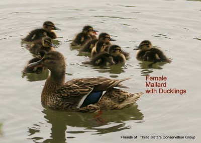 A walk round the Three Sisters is an excellent way to see many birds and to learn to recognize them. The lake is near the car park and this is a good place to start. Here you will see coot, mute swans, Canada geese, water hens, mallard and cross-bred ducks. Common gulls and black headed gulls fly around the lake sharing the food that visitors have thrown for the ducks. In the spring there are often baby chicks to be seen. The coot like to nest on the floating islands and the ducks nest all over the place. This spring [2014] we had our first nesting swans for over ten years.